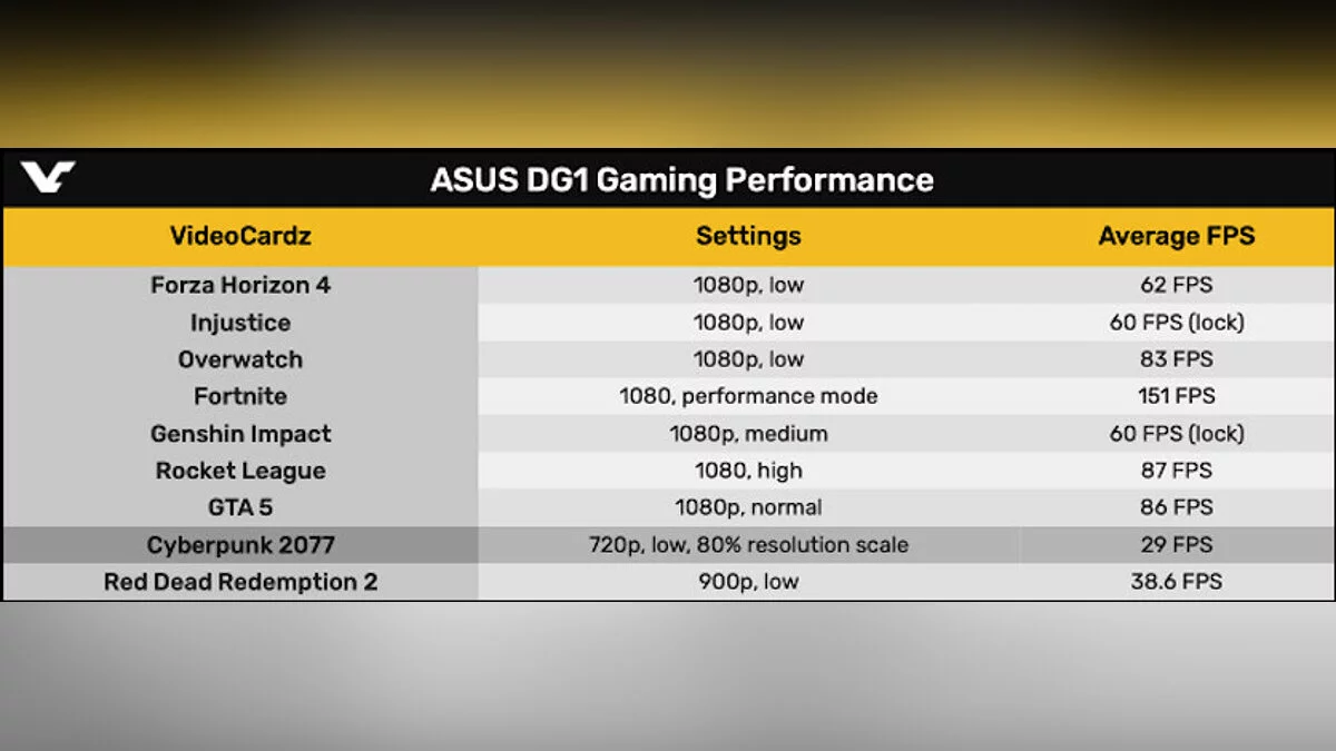 Как оказалось, карта довольно неплохо ведёт себя в играх. В GTA 5 модели DG1 удалось выдать до 86 FPS в разрешении Full HD при «нормальных» настройках графики. В Forza Horizon 4 — 62 FPS при низких. Удалось даже запустить Cyberpunk 2077, но там счётчик кадров не превысил 30 FPS при разрешении 720p и низких настройках качества.