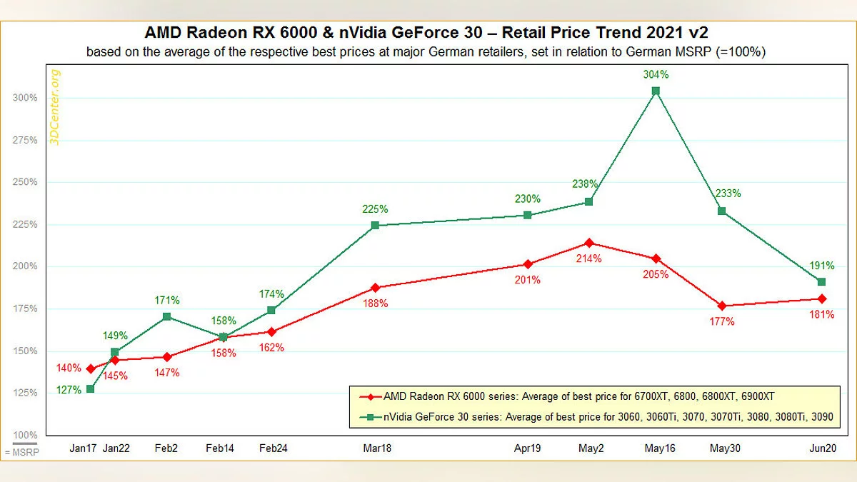 Как видно на графике, карты NVIDIA некоторое время продавались втрое дороже рекомендованной цены, а AMD — вдвое дороже. Однако, судя по последним данным, средняя наценка на видеокарты NVIDIA снизилась с +133% до +91%. Причиной этого стало падение курсов криптовалют, а также появление специальных майниговых карт серии LHR у NVIDIA.