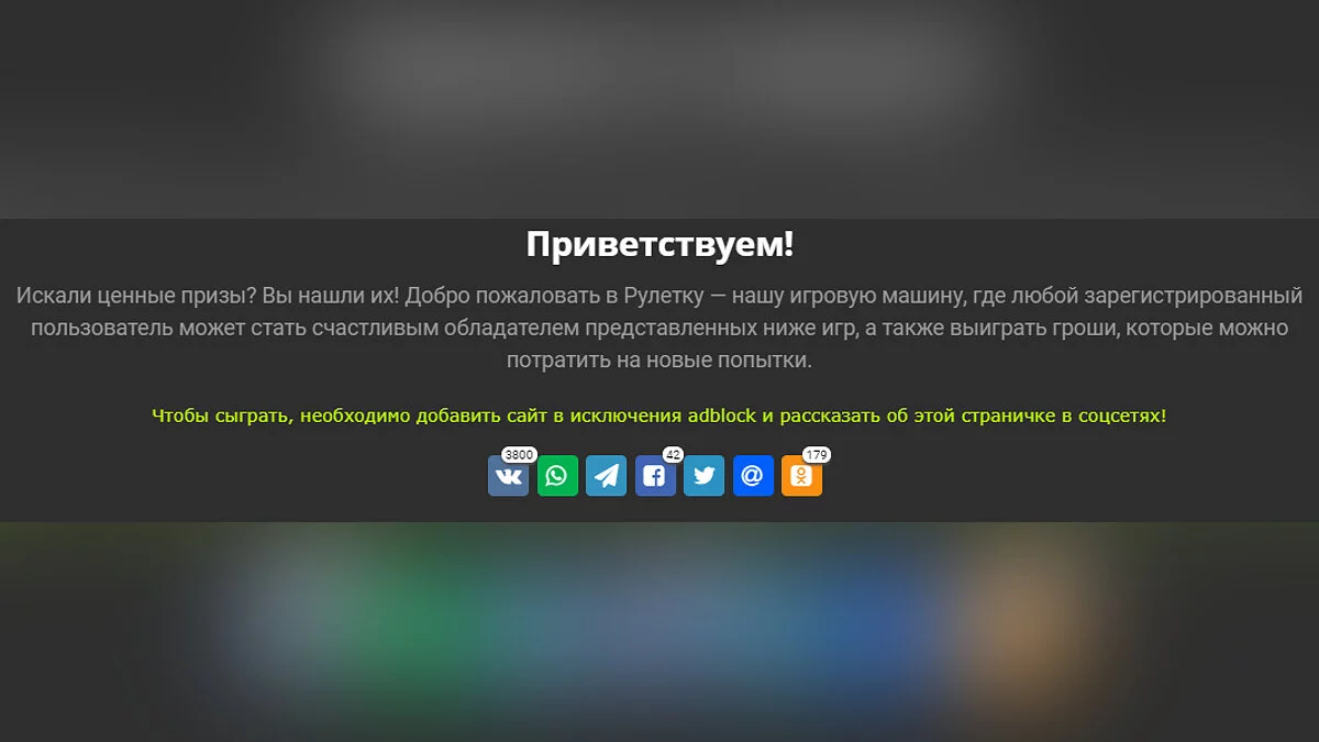 Примечательно, что для участия в рулетке необходимо добавить сайт в исключения adblock и рассказать об этой страничке в соцсетях или мессенджерах (VK, WhatsApp, Telegram, Facebook, Twitter, Мой мир или Одноклассники).