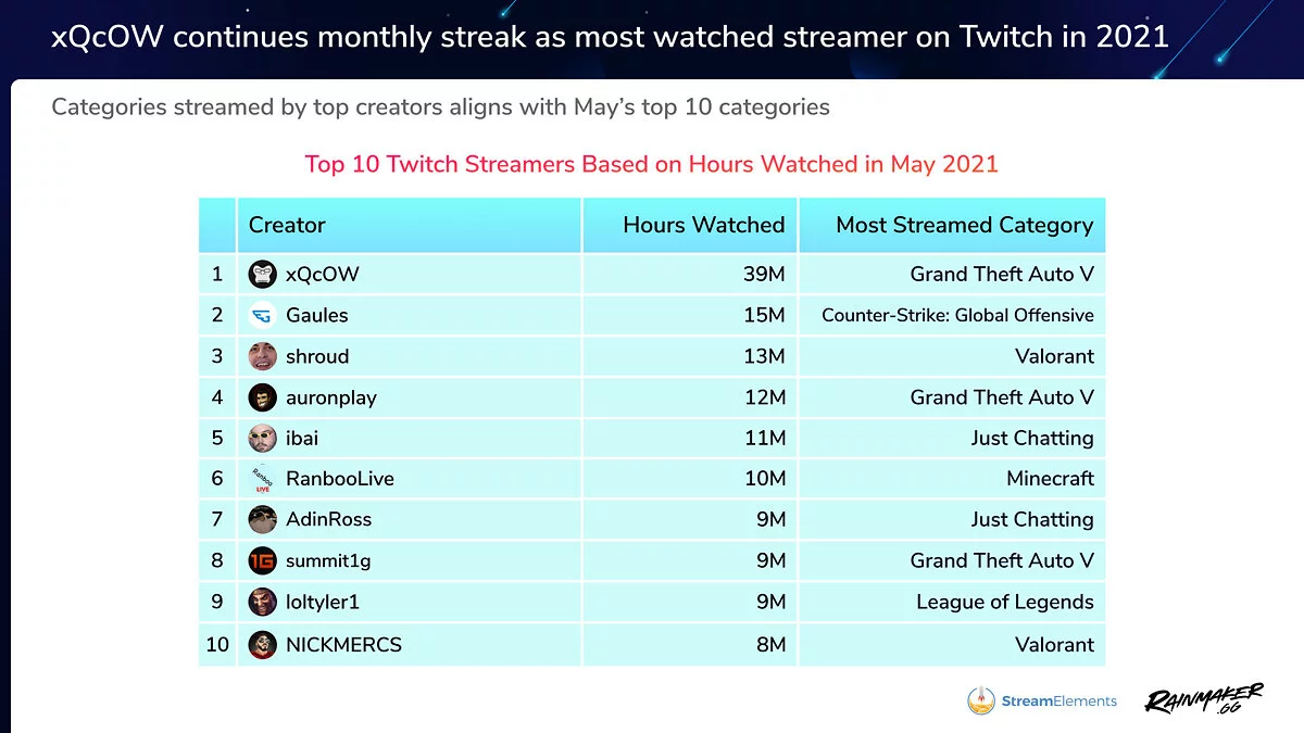 Самым популярным стримером на Twitch продолжает оставаться xQcOW. За май зрители потратили на его трансляции более 39 миллионов часов.