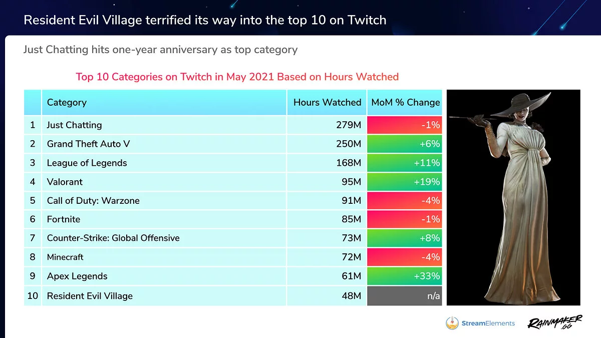 Самой популярной категорией в мае стала Just Chatting. За ней идут игры Grand Theft Auto 5, League of Legends и Valorant. Также в топ-10 попал вышедший 7 мая хоррор Resident Evil Village.