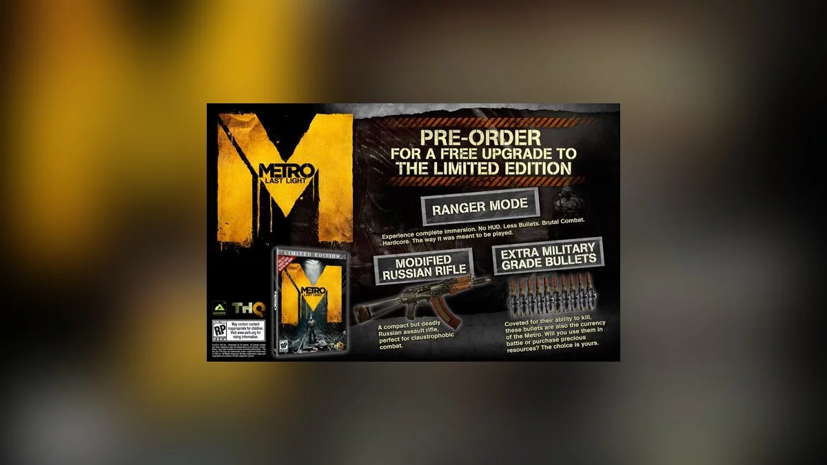 По официальным подтверждениям THQ и 4A Games, постапокалиптический шутер Metro: Last Light выйдет в марте 2013 года. Одновременно с ним в продажу поступит и «Ограниченное издание» (Limited Edition), которое будет включать в себя новый уровень сложности и несколько приятных внутриигровых бонусов.