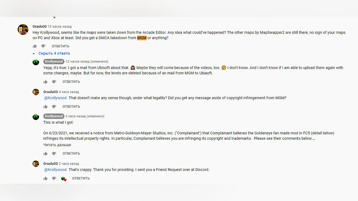 Он коротко уточнил, что Ubisoft удалила все уровни после письма от кинокомпании Metro-Goldwyn-Mayer. Ведь MGM принадлежит часть прав на серию фильмов о Джеймсе Бонде, потому, как утверждается, Krollywood не имеет права публиковать игру или её ремейки в открытом доступе.