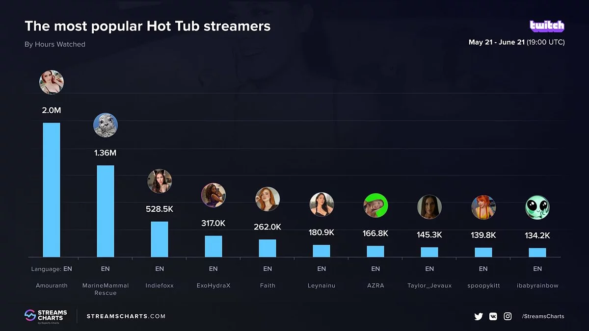 Самой популярной «девушкой в бассейне» стала Кейтлин Сирагуса (Kaitlyn Siragusa), более известная как Amouranth. За четыре недели на просмотр трансляций девушки зрители потратили около 2 миллионов часов. Отмечается, что в среднем на стримах Amouranth присутствует 12 тысяч человек.
