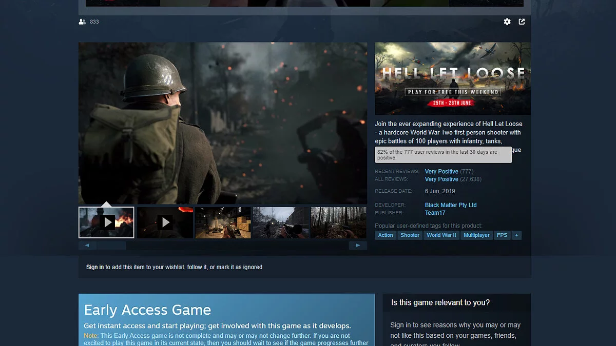 В Steam сейчас можно бесплатно играть в шутер про Вторую мировую войну Hell Let Loose, у которого на момент написания новости 82% положительных отзывов.