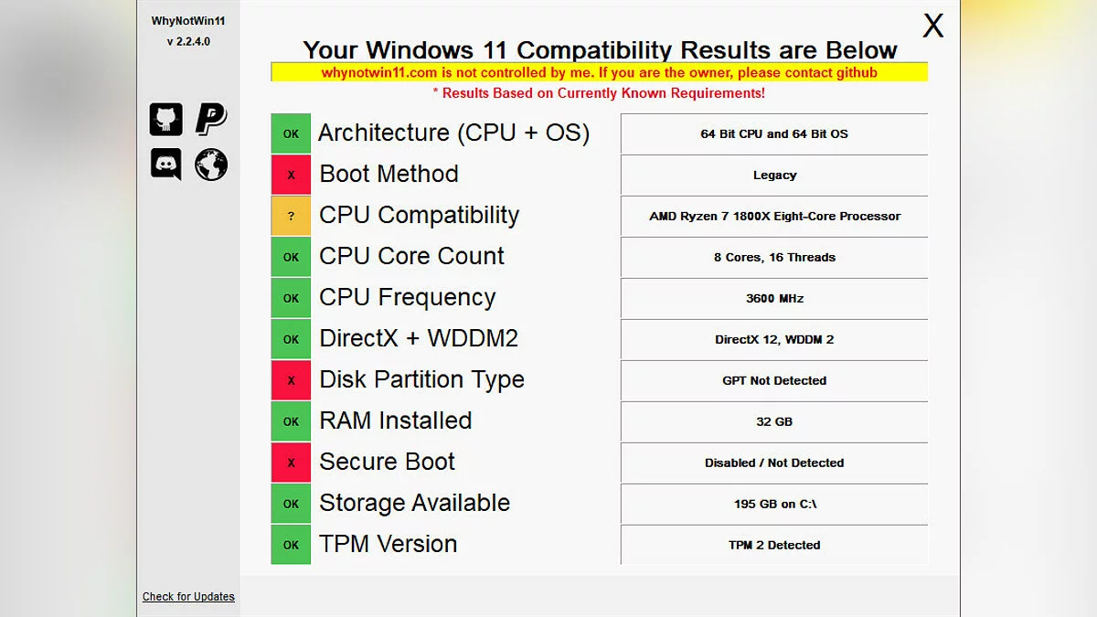 Теперь же энтузиасты выпустили свою утилиту под названием WhyNotWin11, которая в наглядном виде показывает, какие из параметров системы не соответствуют требованиям новой ОС.