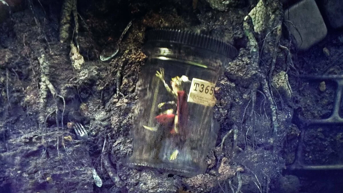 Супергерой-амфибия появляется на девятой минуте, когда Локи спускается в убежище. Когда камера спускается вниз, можно заметить закопанный в грязи Мьёльнир и лягушку в броне и красном плаще, которая пытается выбраться из банки. Это и есть Трог.