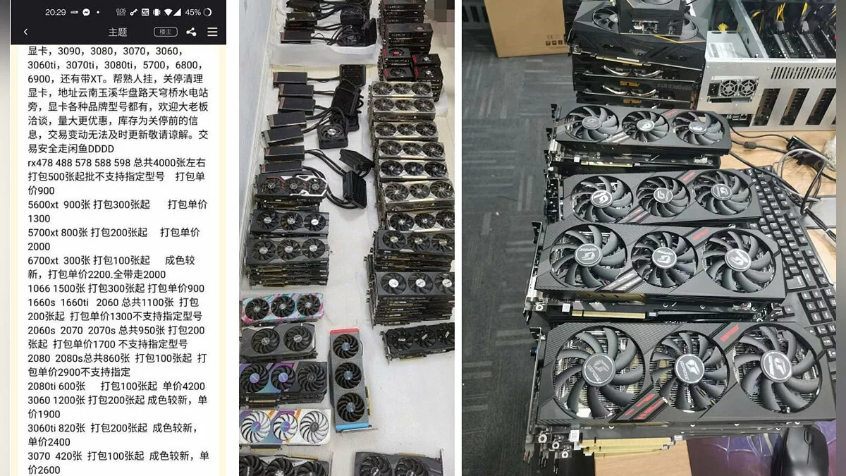 Майнеры активно распродают видеокарты и другое оборудование в Китае. Причём цены на них довольно-таки низкие. Как сообщается, некоторые предлагают купить NVIDIA RTX 3060 за 270 долларов (около 20 тысяч рублей). Это ниже рекомендуемой цены примерно на 50 долларов (около 4 тысяч рублей).