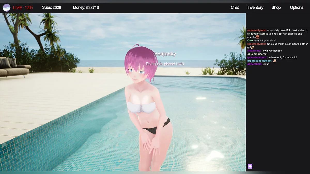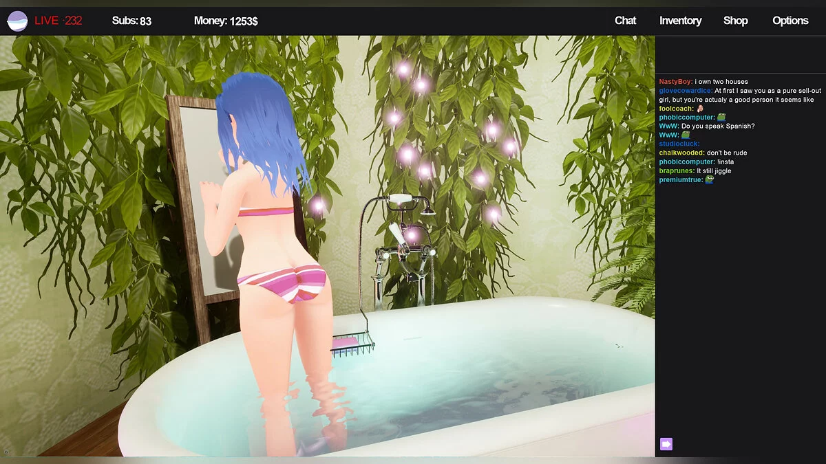 В Hot Tub Simulator игроки смогут окунуться в жизнь «стримерши в бассейне». Чтобы привлечь внимание зрителей, придётся танцевать, одевать милые бикини, писать имена своих подписчиков на доске, разговаривать по телефону и использовать различные разблокируемые навыки, которые помогут удовлетворить аудиторию и сделать трансляцию более интересной.