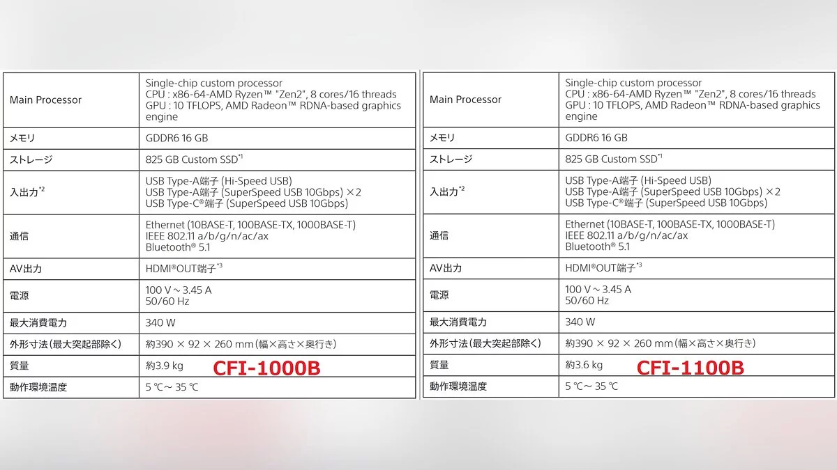 Согласно документации, модель имеет те же габариты, что и предыдущая версия CFI-1000B, однако легче на 300 грамм. Также во второй ревизии изменится винт, которым крепится подставка.
