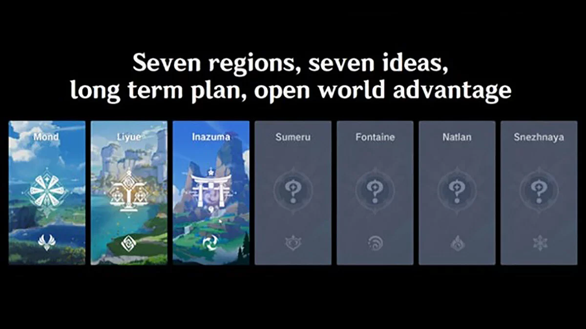 В ходе конференции GDC 2021 авторы Genshin Impact рассказали, что оставшиеся четыре региона появятся в игре в течение следующих четырех лет. Разработчики отметили, что они с самого планировали сделать семь областей.