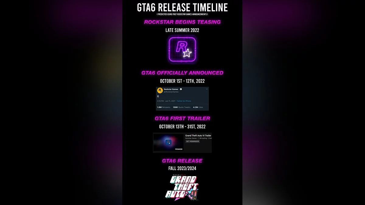 CoryLVV полагает, что Rockstar начнёт публиковать первые тизеры игры в конце лета будущего года, однако это будут, скорее, скриншоты или арты, а не видео. А вот анонса можно ожидать в период с 1 по 12 октября 2022 года. Что касается полноценного трейлера, то его, по мнению CoryLVV, покажут в диапазоне с 13 по 31 октября 2022 года.