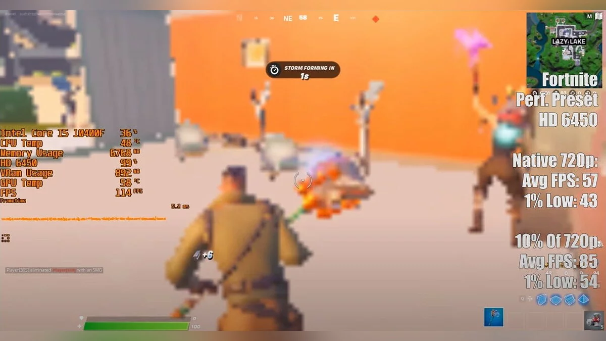 - Fortnite — 57 FPS при 720p и 85 FPS при 72p;
