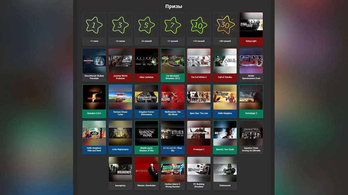 Также в рулетке можно выиграть Dying Light, Jurassic World Evolution, Alien: Isolation, The Evil Within 2, Call of Cthulhu, Resident Evil 5, Kingdom Come: Deliverance, Wolfenstein: The Old Blood, Spec Ops: The Line, Little Nightmares и другие отличные проекты.