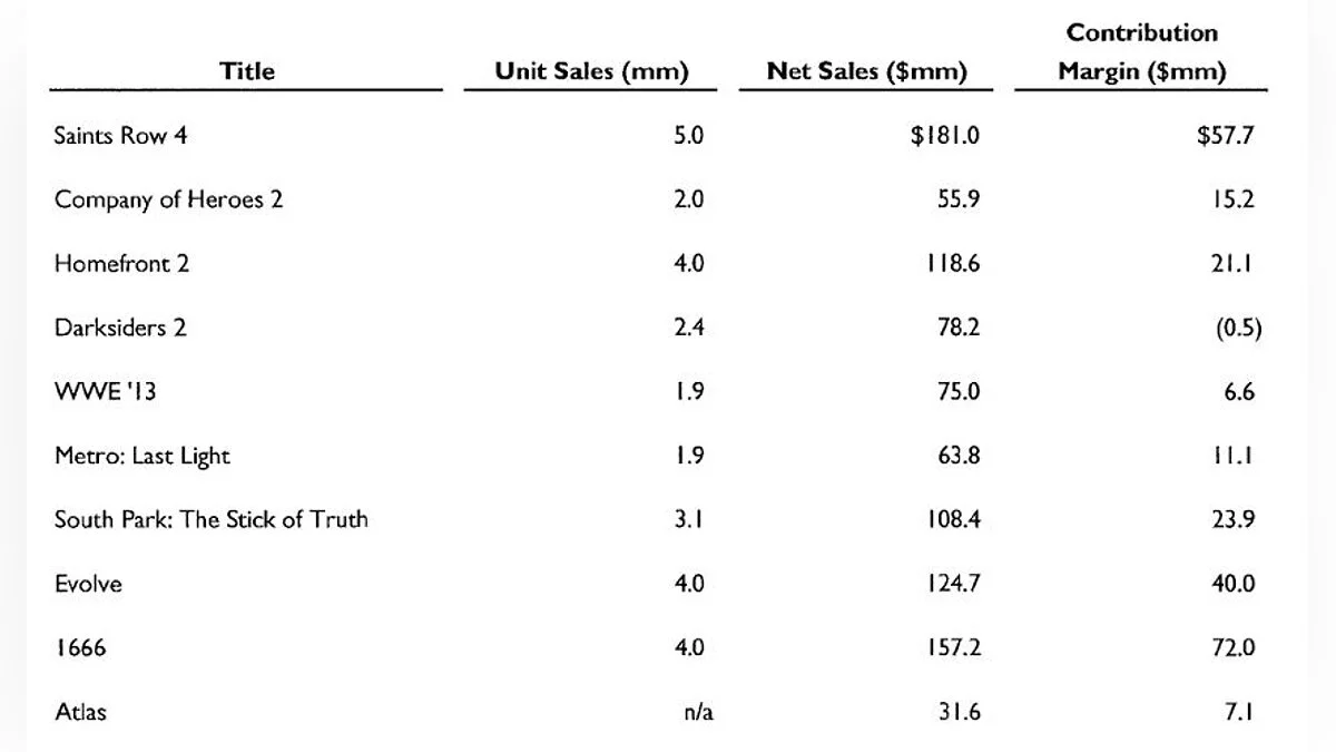 Из этих данным мы узнаем, что пока-что ни Darksiders 2, ни WWE 13 не могут похвастаться солидной доходностью. Тем не менее, THQ ожидает хороших прибылей от Metro: Last Light, Homefront 2 и Saints Row 4.