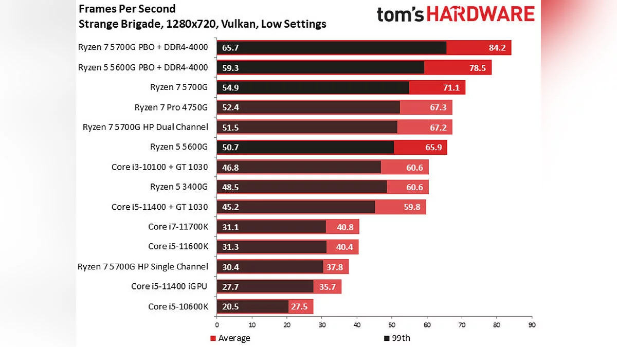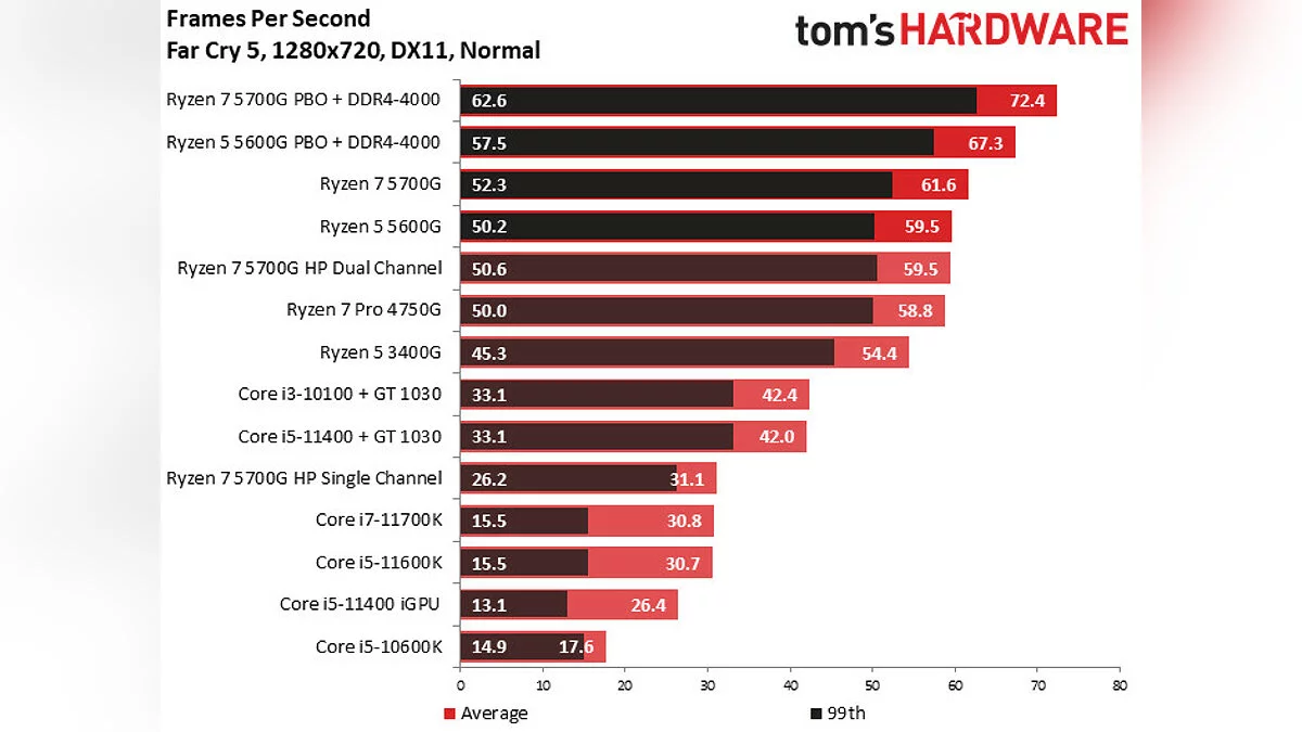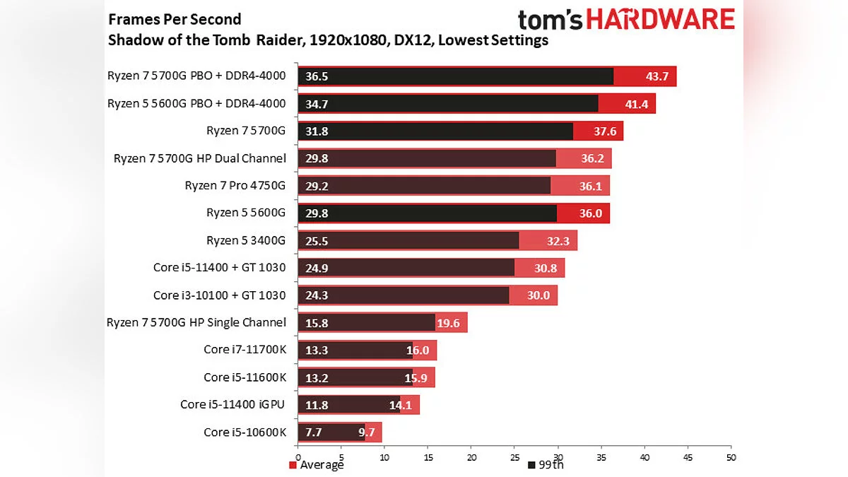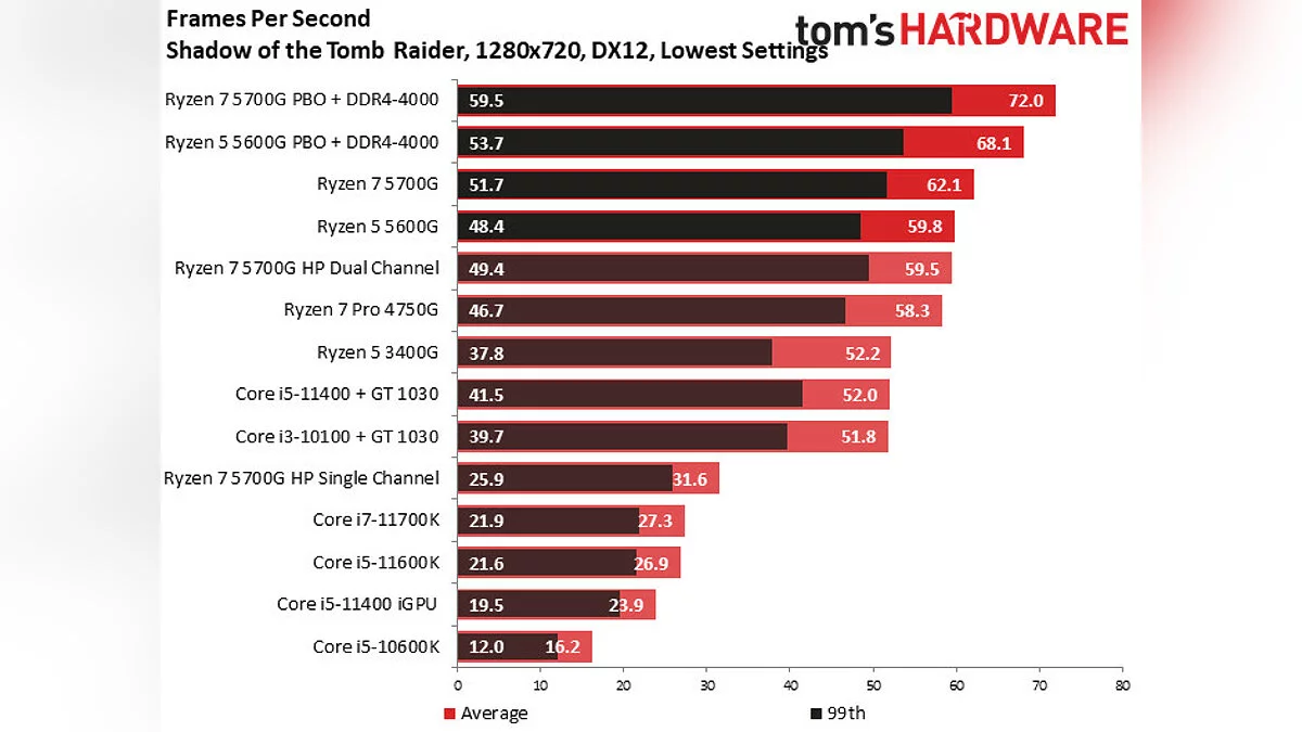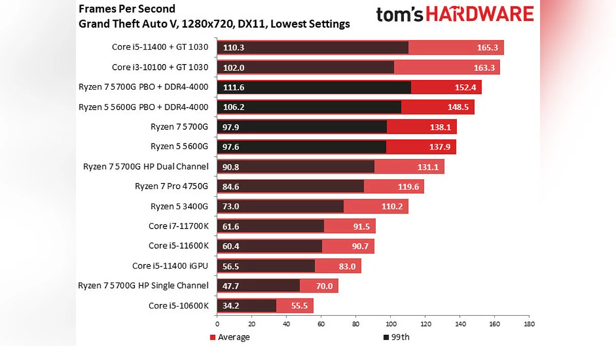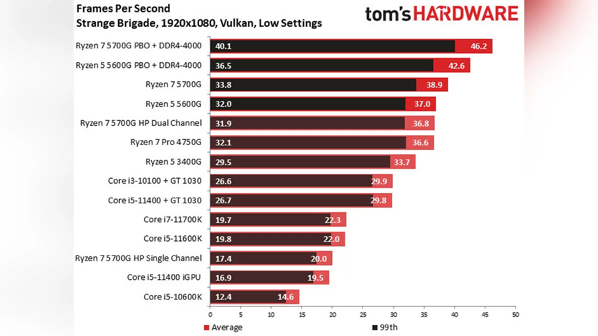 Согласно отчёту Tom's Hardware, новый процессор отлично показывает себя в системах с быстрой оперативной памятью (уровня DDR4-3200). Более того, у него при этом оказывается самая быстрая встроенная графика, хотя она всего на 7% опережает Ryzen 7 4750G прошлого поколения Renoir.