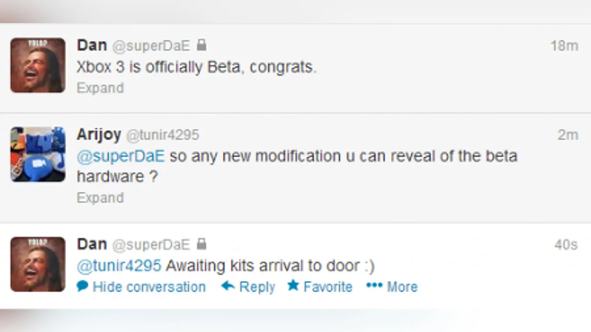 Человек под ником SuperDAE, сливший в есть изображения комплекта средств разработки для Durango, также сказал, что Xbox 720 (или Xbox 3, как он назвал консоль) официально находится на стадии бета-тестирования. Вскоре SuperDAE удалил все твиты, однако добрые люди успели-таки сделать скриншот: