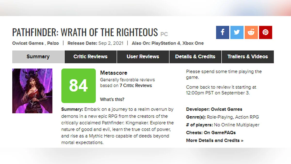 Кстати, на Metacritic Pathfinder: Wrath of the Righteous получила 84 балла, что делает ее одной из самых высокооцененных игр для ПК за этот год. С нашим обзором можете ознакомиться здесь.