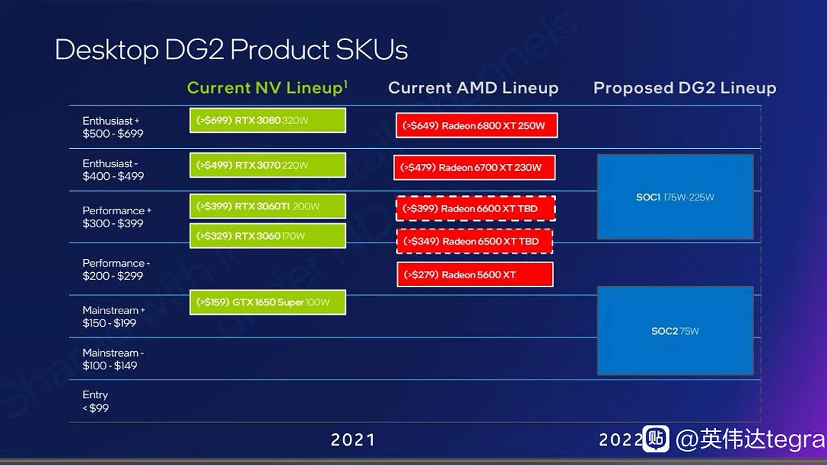 Судя по изображению, старшие модели с теплопакетом от 175 до 225 Вт будут конкурировать с NVIDIA RTX 3060 и RTX 3070, а также с AMD Radeon RX 6500 XT и RX 6700 XT. Указанный диапазон цен составляет 303-500 долларов (от 22 до 36,5 тысячи рублей).
