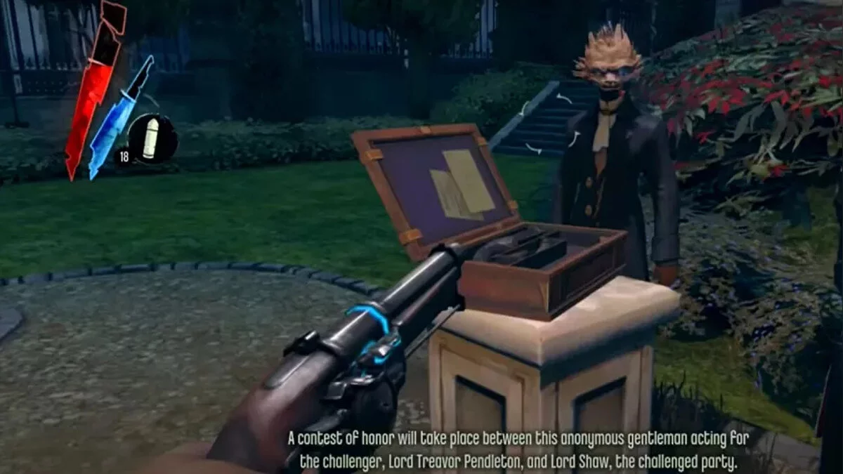 В этой сцене главный герой Кольт сталкивается лицом к лицу с антагонистом Джулианой, которая явно ждет его появления. Она демонстрирует герою богато украшенный деревянный ящик, в котором хранится пара дуэльных пистолетов, которые она называет «старинными предметами». По словам Джулианы, это музейные экспонаты и часть истории, потому их стоит сохранить.