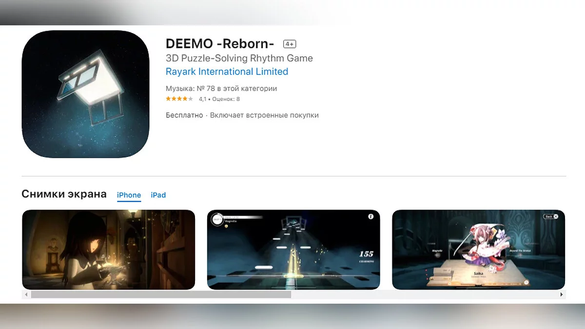 - Deemo Reborn — музыкальная игра про девочку, упавшую с неба и оказавшуюся в древнем волшебном замке (загрузить бесплатно).