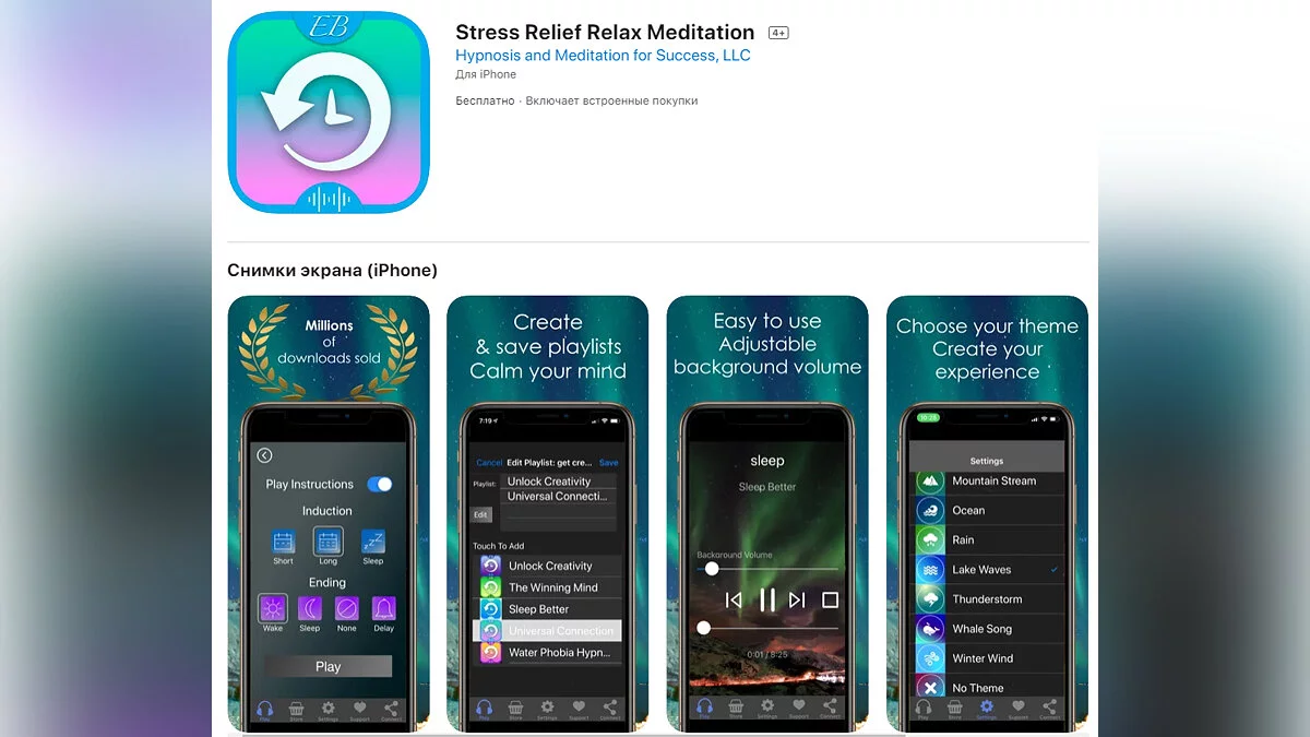 - Stress Relief Relax Meditation — приложение с набором успокаивающей музыки для медитации (загрузить бесплатно).