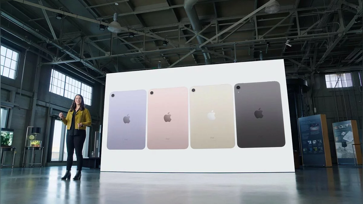 Размер экрана 8.3", но габариты корпуса те же — всё за счёт узких рамок. Будет несколько цветов. Есть Touch ID сверху в кнопке включения, а также порт Type-C, быстродействие выше на 40%, чем у предшественника.