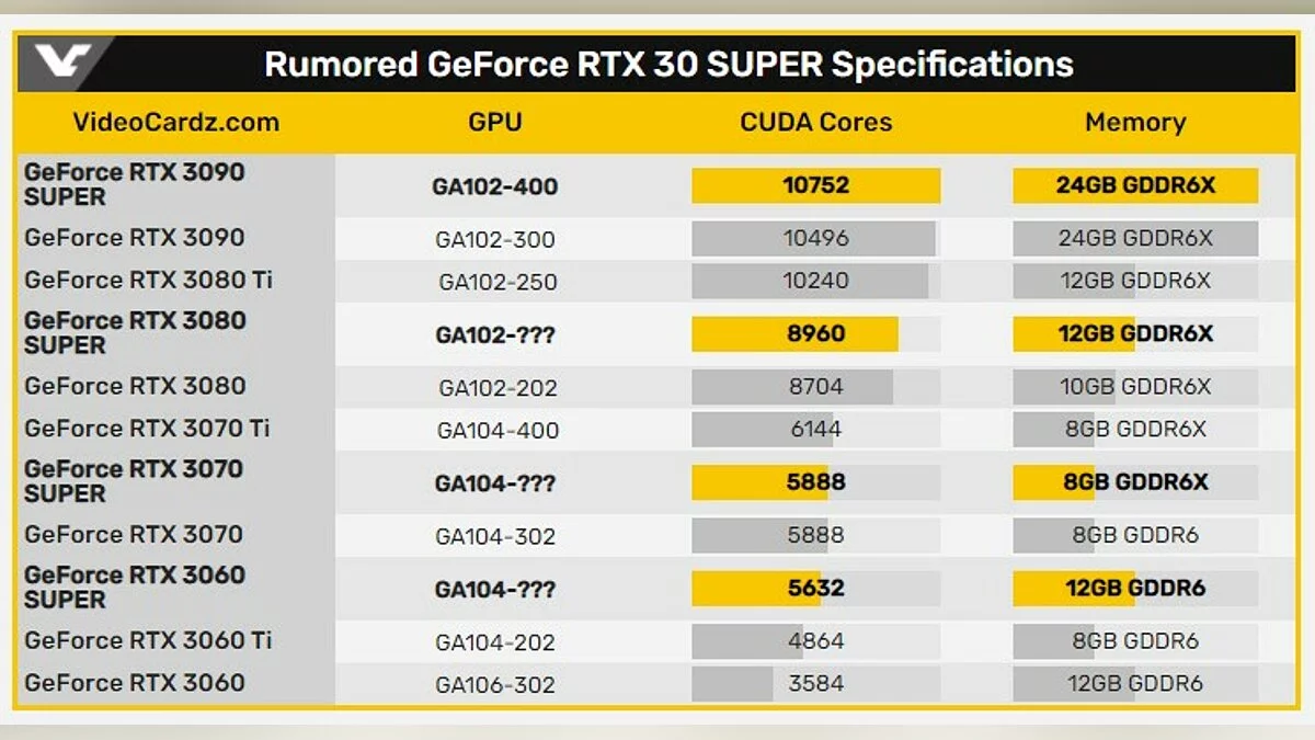 По его данным, разные модели карт будут по-разному отличаться от обычных RTX. К примеру, RTX 3060 Super получит 768 дополнительных ядер CUDA. У неё будет также 12 ГБ видеопамяти. А вот RTX 3070 Super будет отличаться от стандартной RTX 3070 только типом памяти — GDDRX6 вместо обычной GDDR6.