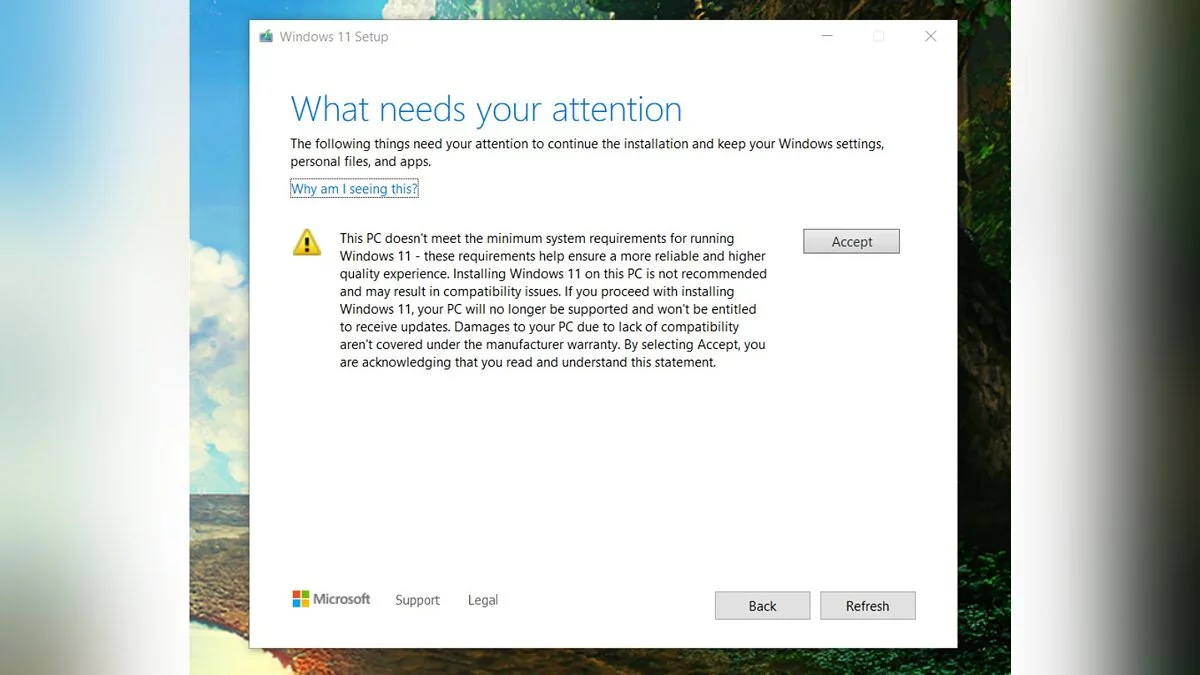 Это устройство не соответствует минимальным системным требованиям для работы Windows 11, которые обеспечивают более надежную и эффективную работу. Не рекомендуется устанавливать Windows 11 на этот компьютер — это может привести к проблемам с совместимостью. Если вы продолжите установку, ваш компьютер больше не сможет получать обновления системы. Нанесённый установкой ущерб устройству из-за несовместимости не покрывается гарантией производителя. Нажав «Принять», вы подтверждаете, что прочитали и приняли это сообщение.
