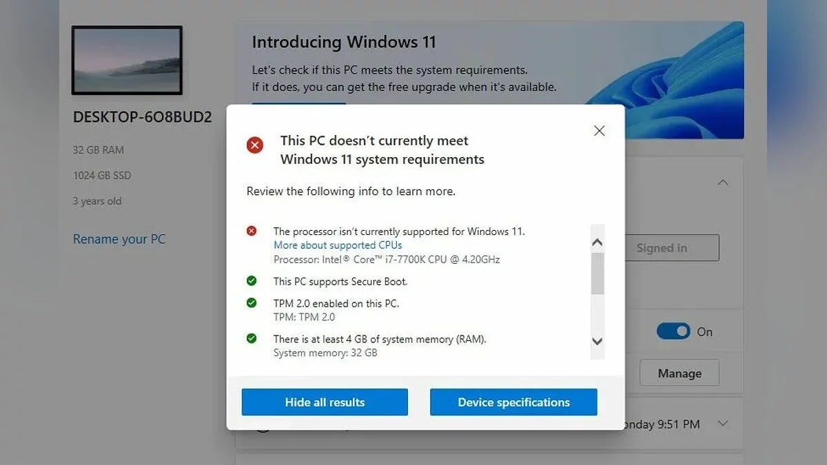 Компания Microsoft позволит обновить старые компьютеры до Windows 11, но при этом пользователи будут делать это на свой страх и риск. Такое сообщение выдаёт утилита PC Health Check при попытке установить последнюю бету ОС.