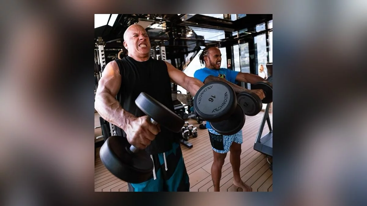 Вин Дизель (Vin Diesel) продолжает показывать в Instagram (признано в России экстремистской организацией), как занимается физическими тренировками. На новом фото можно увидеть, как актер качает мышцы вместе с британским автогонщиком Льюисом Хэмилтоном (Lewis Hamilton).