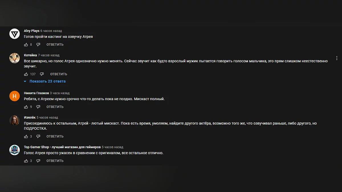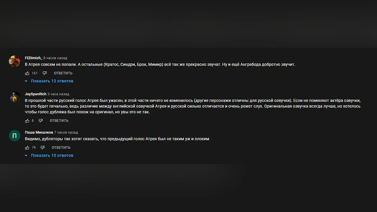 Хотя ролик почти не набрал дизлайков, у российских пользователей возникли вопросы касательно локализации. Смутила озвучка повзрослевшего Атрея, для роли которого наняли другого актера. Если заглянуть в комментарии, то можно увидеть, что множество игроков просят подобрать другого человека.