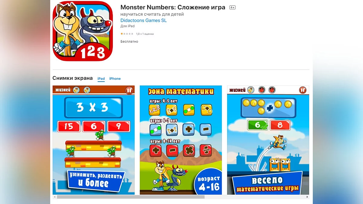 - Monster Numbers: Mental Math — набор математических игр для детей (загрузить бесплатно);