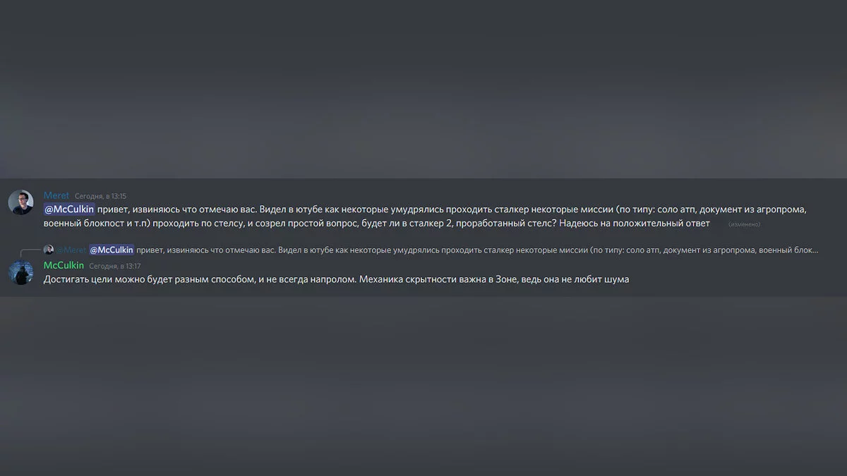 Как все наверняка помнят, в оригинальной трилогии S.T.A.L.K.E.R. присутствовала механика стелса. Пусть она и работала из рук вон плохо, некоторые умельцы все же смогли пройти игры в «невидимом» режиме. Сегодня один из коммьюнити-менеджеров GSC Game World подтвердил на официальном Discord-сервере, что стелс появится и в S.T.A.L.K.E.R. 2.