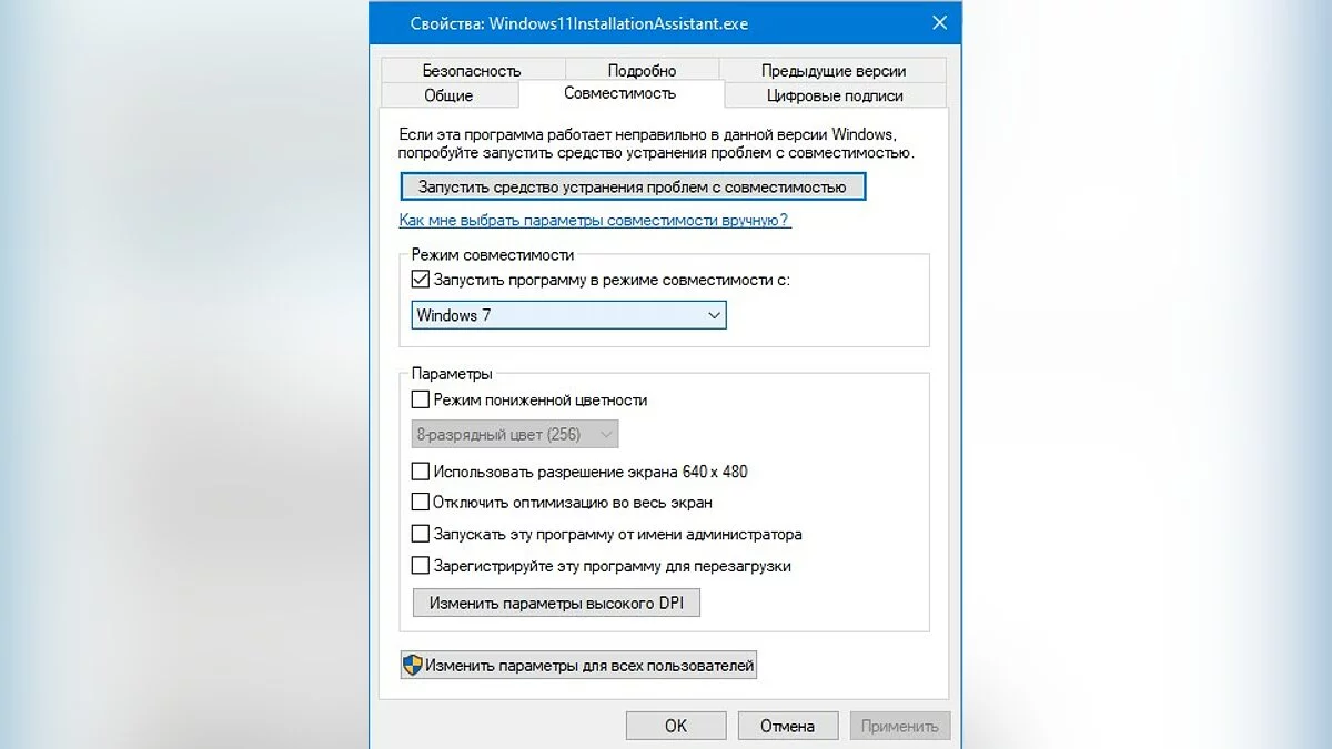 Windows 11 Installation Assistant нужно запустить в режиме совместимости с Windows 7. Для этого надо щёлкнуть правой кнопкой по пусковому файлу, выбрать «Свойства» —> «Совместимость» и там поставить галочку рядом с Windows 7, выбрав её в списке. Затем нужно нажать ОК.