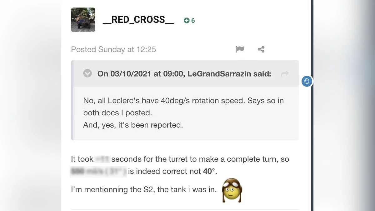 В прошедшее воскресенье пользователь под ником __RED_CROSS__ опубликовал на форуме секретные данные о французском танке Leclerc. Ему не понравилось, что скорость поворота башни отличается в игре и в реальности. В доказательство он привёл отрывки из руководства для стрелка этой модели танка.