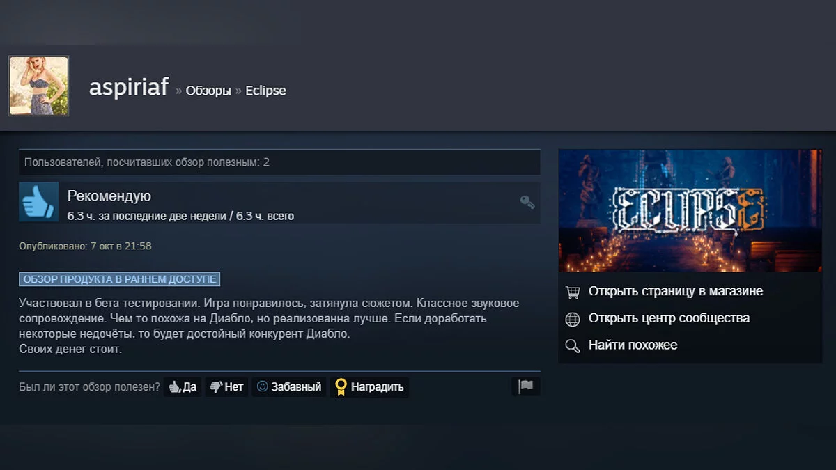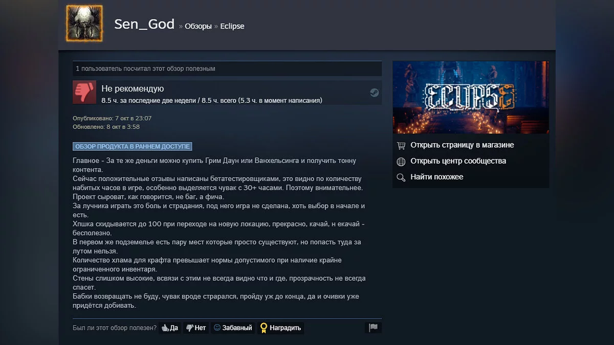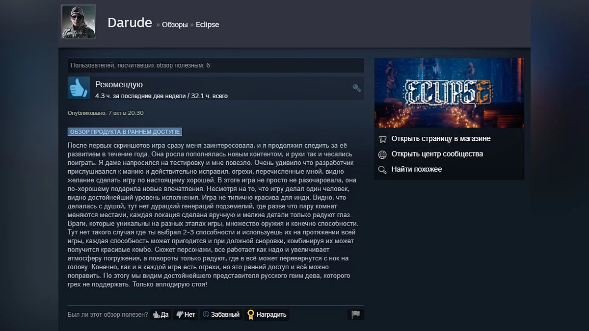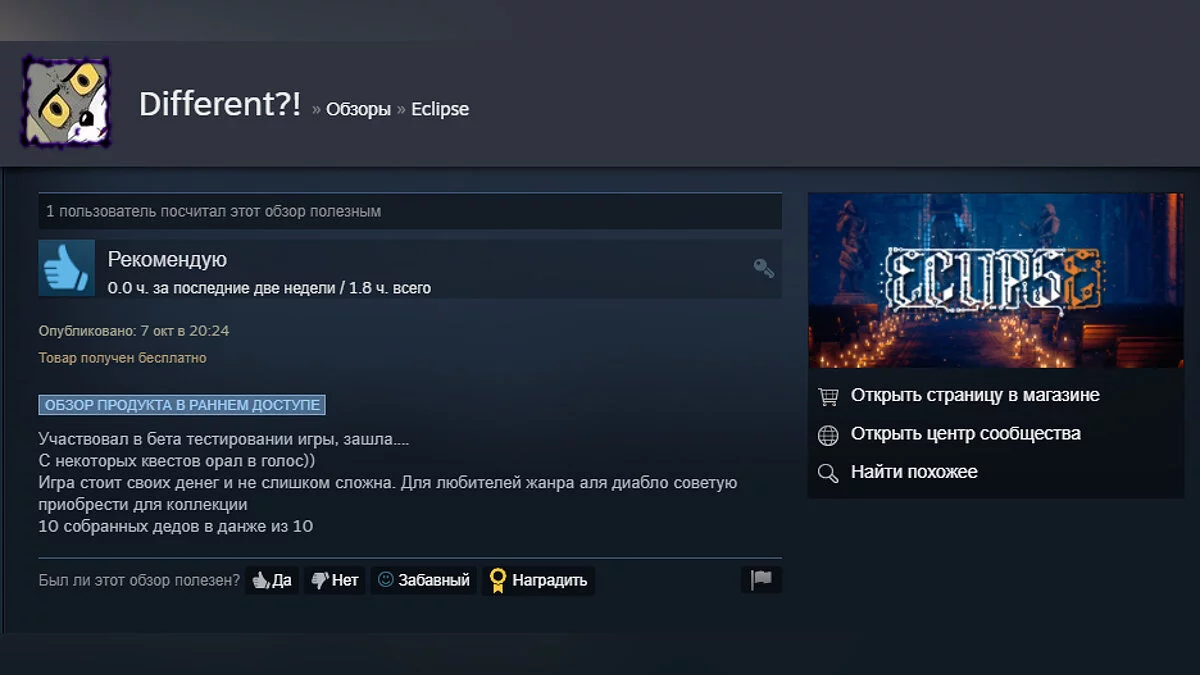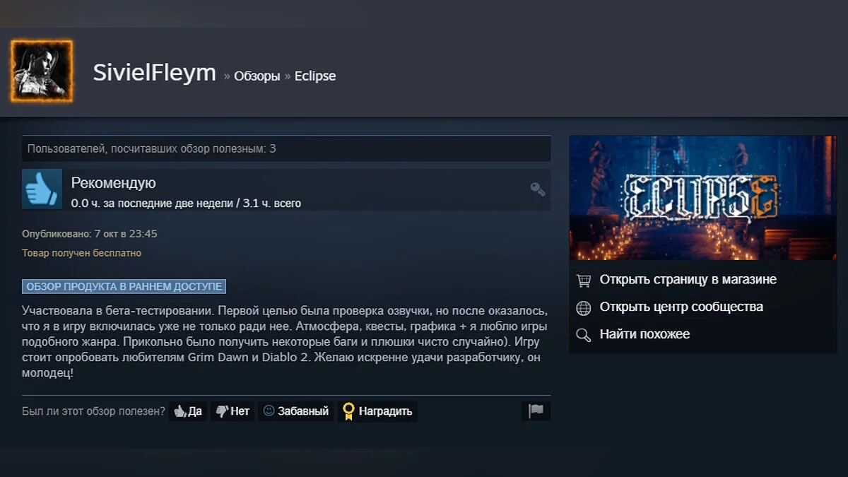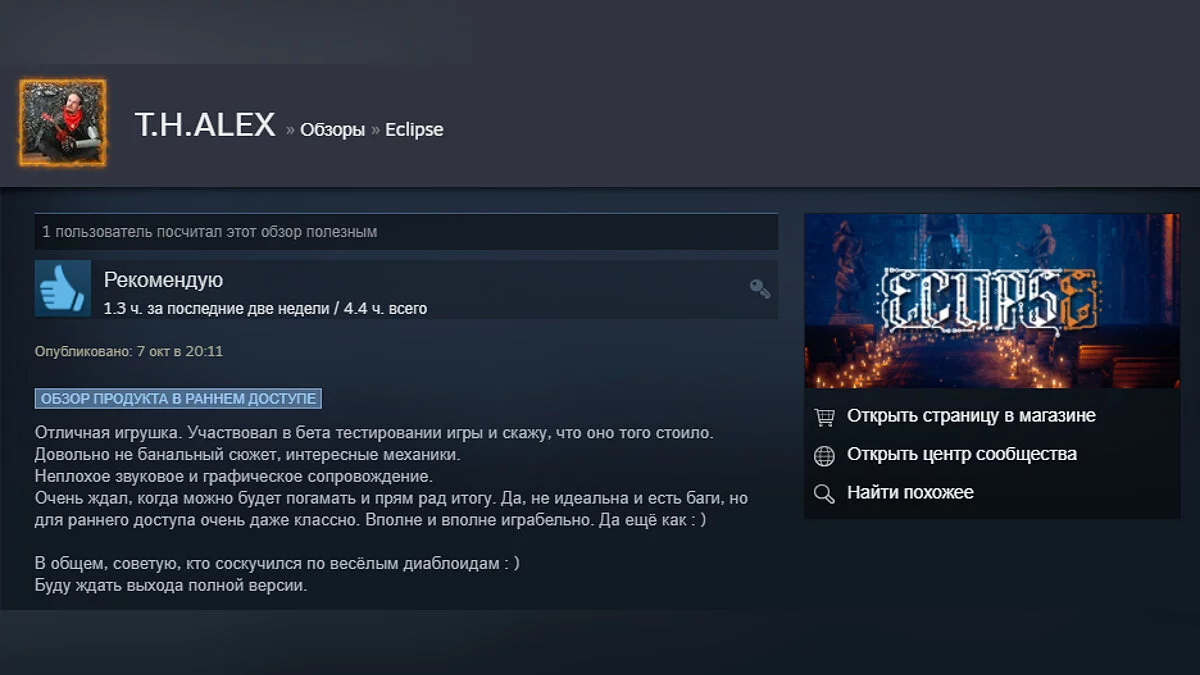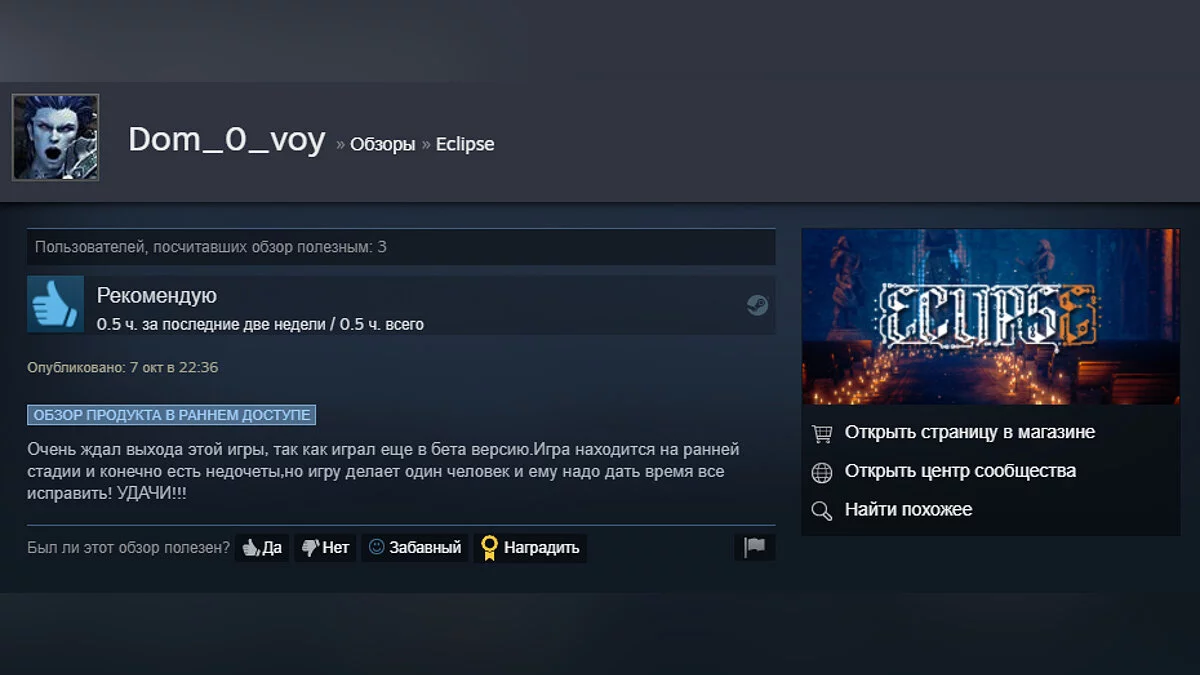 Я очень переживаю за проект, переживаю за то, как игра будет работать на разных компьютерах, переживаю за то, что будет с Eclipse дальше. В любом случае, если вы столкнетесь с техническими проблемами в игре — я надеюсь на ваше понимание (в группе ВК есть специальная тема, где можно будет оставить сообщение о багах, то же самое есть в Discord канале и в темах обсуждений самого Steam). Я буду собирать информацию, и после своего маленького отпуска, начну работать над патчами, контентом и улучшениями к Eclipse.
