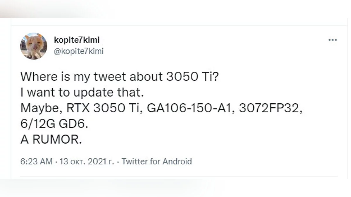Инсайдер под ником kopite7kimi сообщил, что компания может готовить десктопную карту RTX 3050 Ti, которая получит графический процессор GA106-150-A1 с 3072 активными ядрами CUDA. Точно такой же чип используется в GeForce RTX 3060. А вот мобильная RTX 3050 Ti основана на GPU GA107 с 2560 ядрами CUDA.