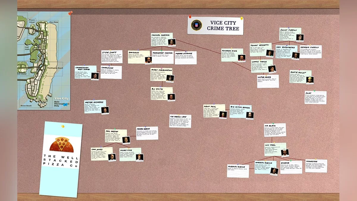 Теперь вы можете увидеть отношения, связывающие самых разных членов криминального мира Vice City: от королей криминала Сонни Форелли (Sonny Forelli) и полковника Кортеза (Colonel Cortez) до мелкой шушеры вроде Кэма Джонса (Cam Jones) и шеф-повара Лео Тила (Leo Teal).