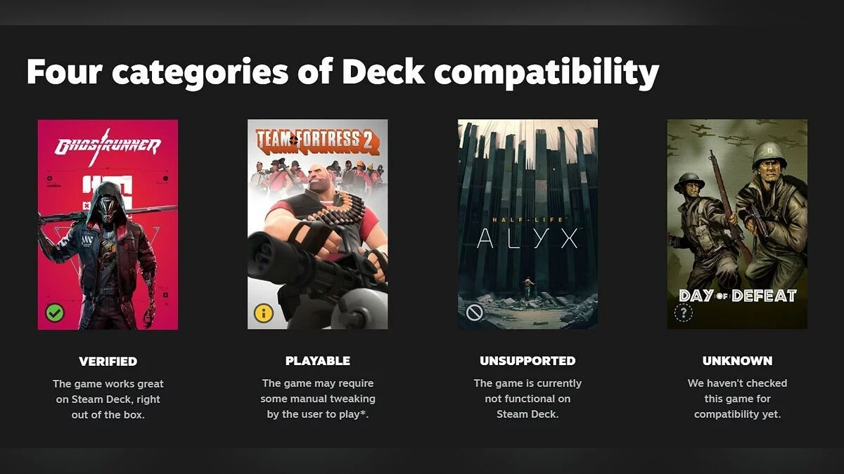 По мере приближения к релизу консоли Steam Deck всё более актуальным становится вопрос о том, какие игры совместимы с новинкой, а какие — нет. В Valve сообщили, что проверят все игры в библиотеке и распределят их по четырём разным категориям.