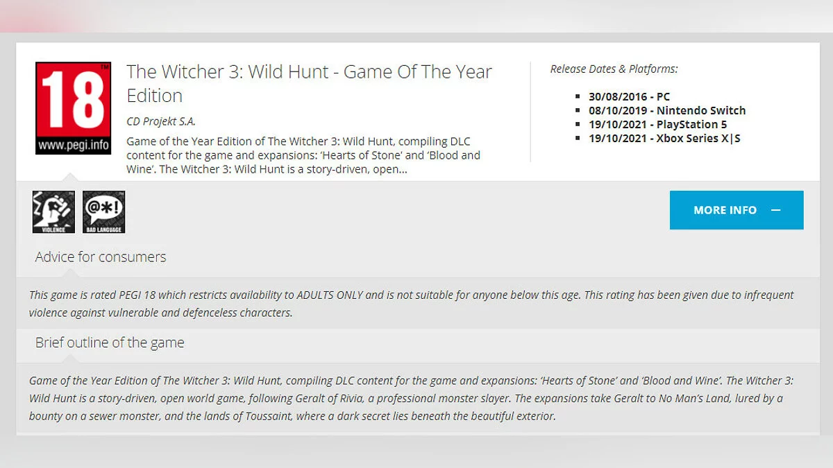 CD Projekt RED обещала, что выпустит до конца года ремастер The Witcher 3. Сегодня на сайте рейтингового агентства PEGI некстген-версия проекта для PS5 и Xbox Series X/S получила рейтинг 18+.