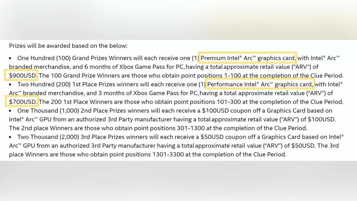 Как сообщается, по условиям конкурса 300 человек могут выиграть одну из двух моделей видеокарт. Первые победители получат 100 ускорителей Intel Arc Premium и подписку Xbox Game Pass на 6 месяцев. Остальным 200 достанутся карты Intel Arc Performance и Xbox Game Pass на 3 месяца.