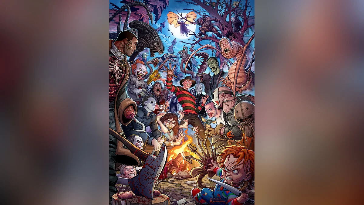 Среди них можно увидеть Фредди Крюгера, Джейсона Вурхиза, Ксеноморфа, Пеннивайза, Майкла Майерса, Чаки, Джиперса Криперса и не только. Над артом художник работал последние несколько месяцев.