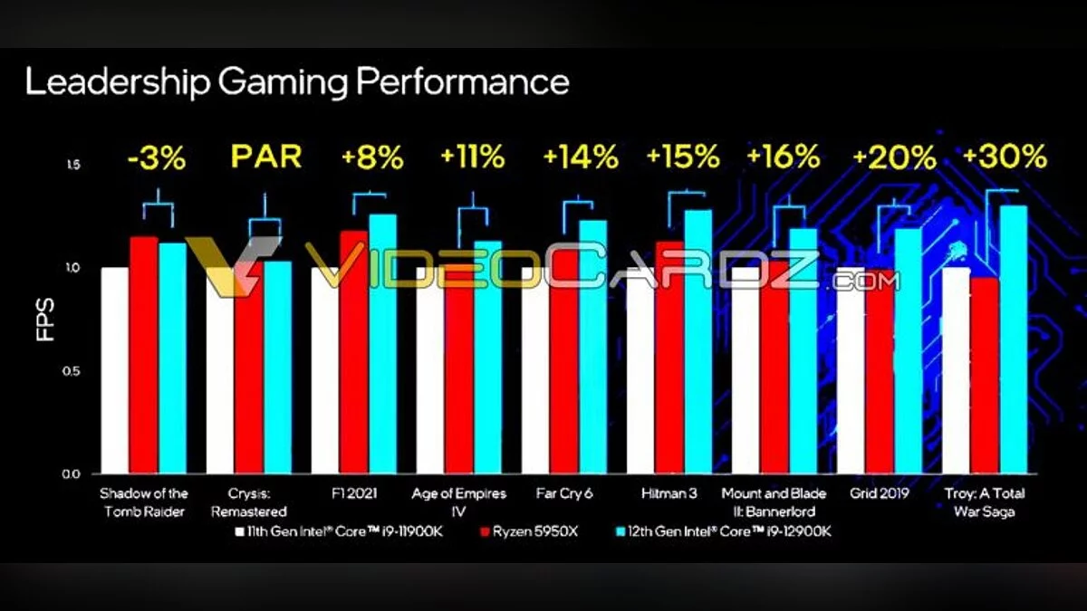Также опубликованы первые результаты тестирования, пока что внутреннего. Как видно, процессор Core i9-12900K с лёгкостью обходит 16-ядерный AMD Ryzen 9 5950X почти во всех играх. Уступает он только в Shadow of the Tomb Raider.