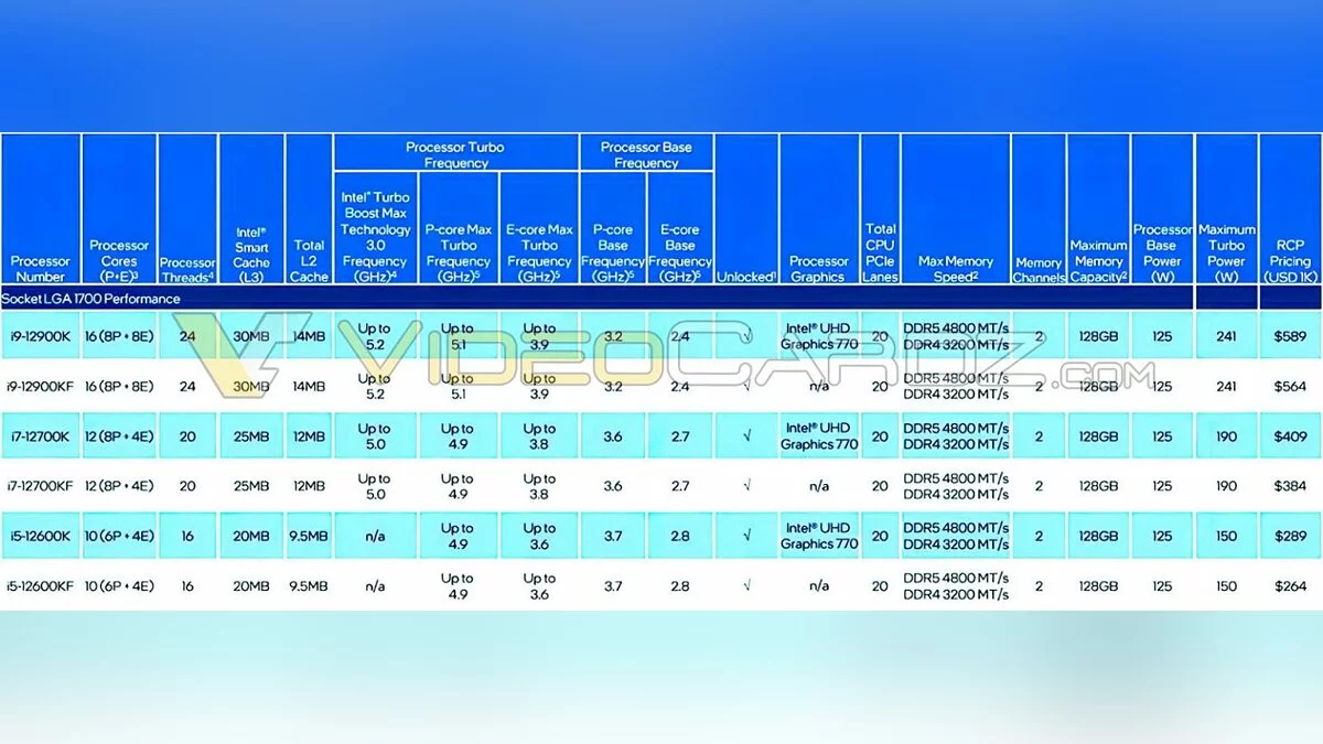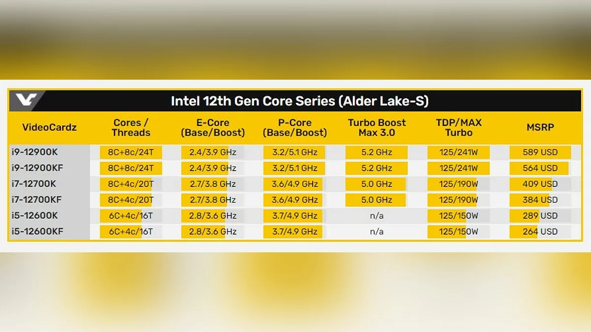 Речь на данный момент идёт о моделях Core i5-12600K, Core i7-12700K и Core i9-12900K и версиях с индексом KF — это модели с разгоном и отключённым видеоядром. В версиях K оно активировано.