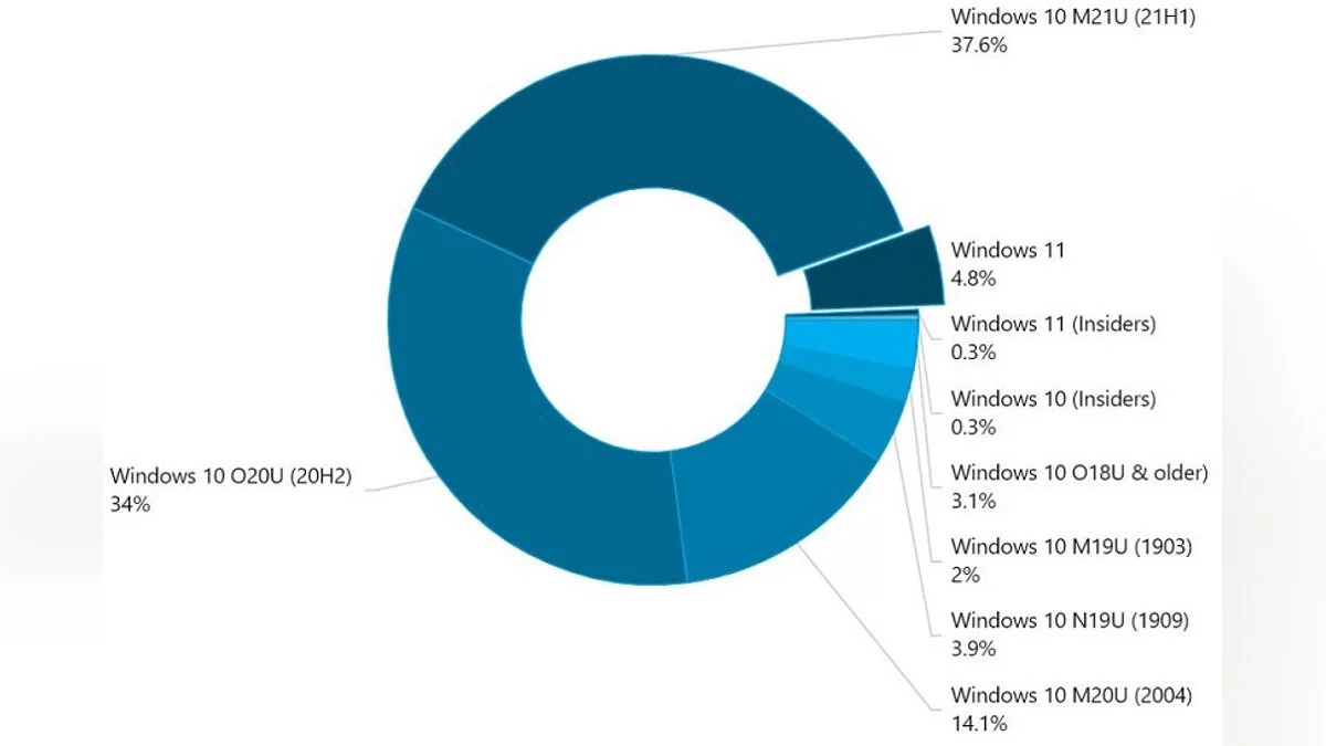 Фактически, обновление сдерживают разве что строгие системные требования, хотя их вполне возможно обойти. Потому стоит ожидать лавинообразного роста. При этом самыми популярными остаются Windows 10 21H1 и 20H2. Их доли составляют, соответственно, 37,6% и 34%. Отметим также, что скоро Microsoft выпустит обновление 21H2.
