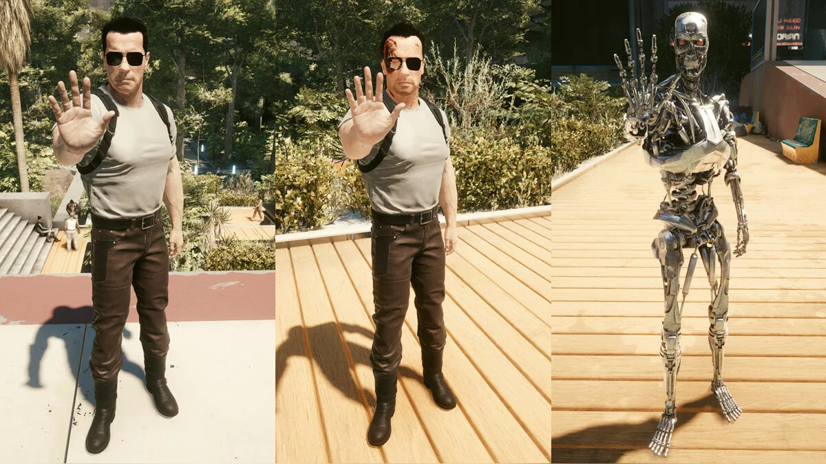 Пользователь Nexus Mods под ником AlvarixPT заменил главного героя Cyberpunk 2077 на Арнольда Шварценеггера (Arnold Schwarzenegger) в роли Терминатора. Разработчик добавил три разных скина: классический, с поврежденной головой и облик металлического робота.