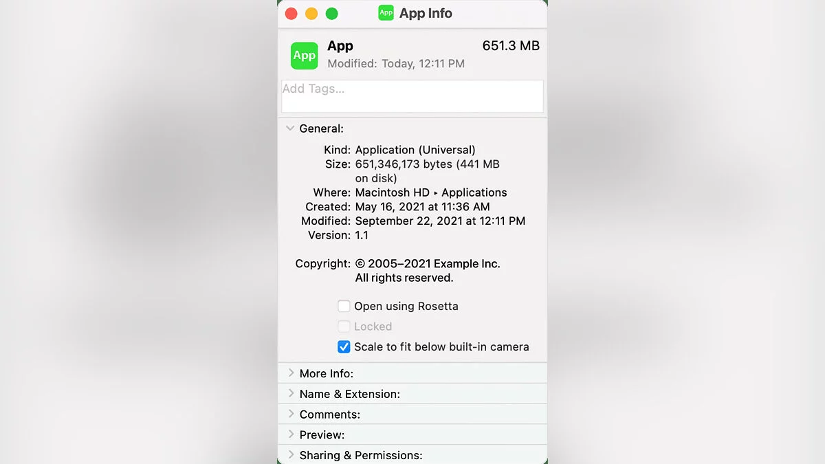 Good news for notch haters! If you've got an app (or apps) with menus that collide with the notch, just Get Info on the app, and enable "Scale to fit below built-in camera".