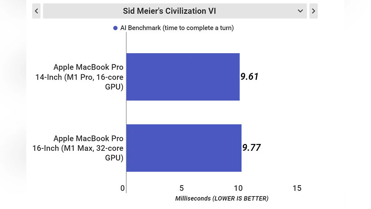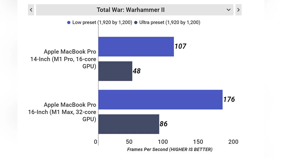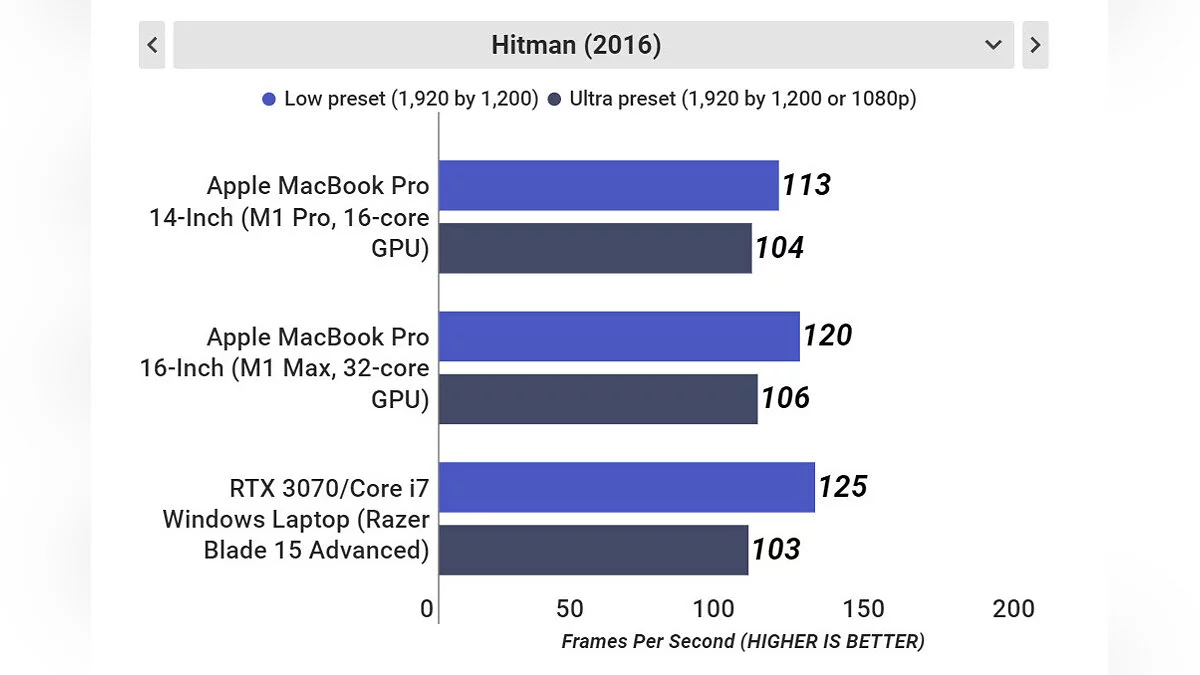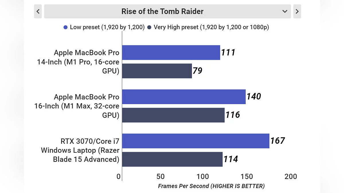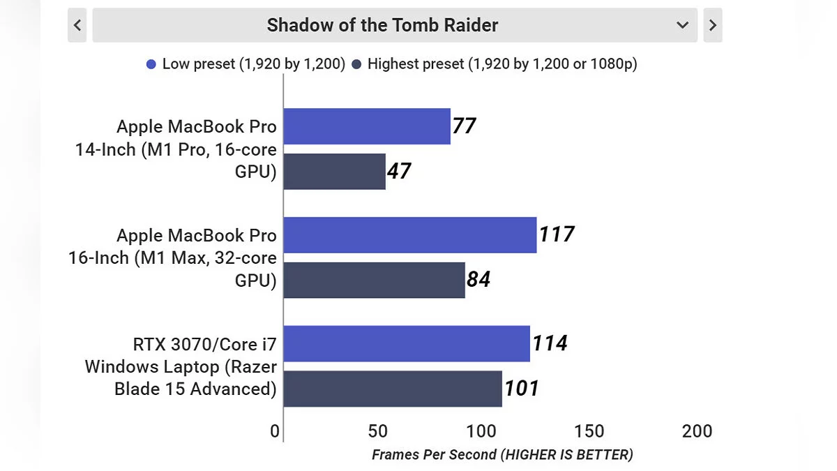 Ранее мы писали о результате в бенчмарке Tomb Raider, где SoC M1 Max выступила на уровне мобильной GeForce RTX 3060. Но теперь появились данные уже по трём играм. Судя по всему, игровую производительность «яблочных» ноутбуков сравнивали с Razer Blade 15 Advanced Edition с мобильной видеокартой RTX 3070 мощностью в 95 Вт.