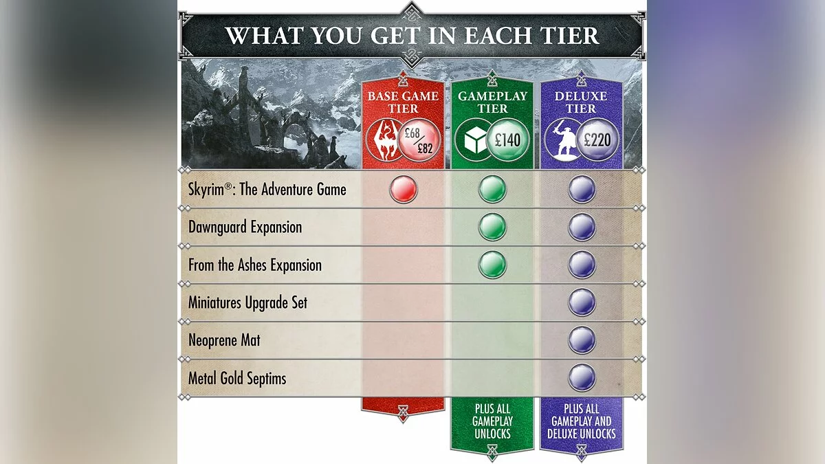 Стандартная версия The Elder Scrolls 5: Skyrim The Adventure Game стоит £82 (8 тыс. рублей). Будут также выпущены расширенные издания за £140 (13,7 тыс. рублей) и £220 (21,6 тыс. рулей). Они будут включать в себя дополнительный контент, включая DLC Dawnguard.